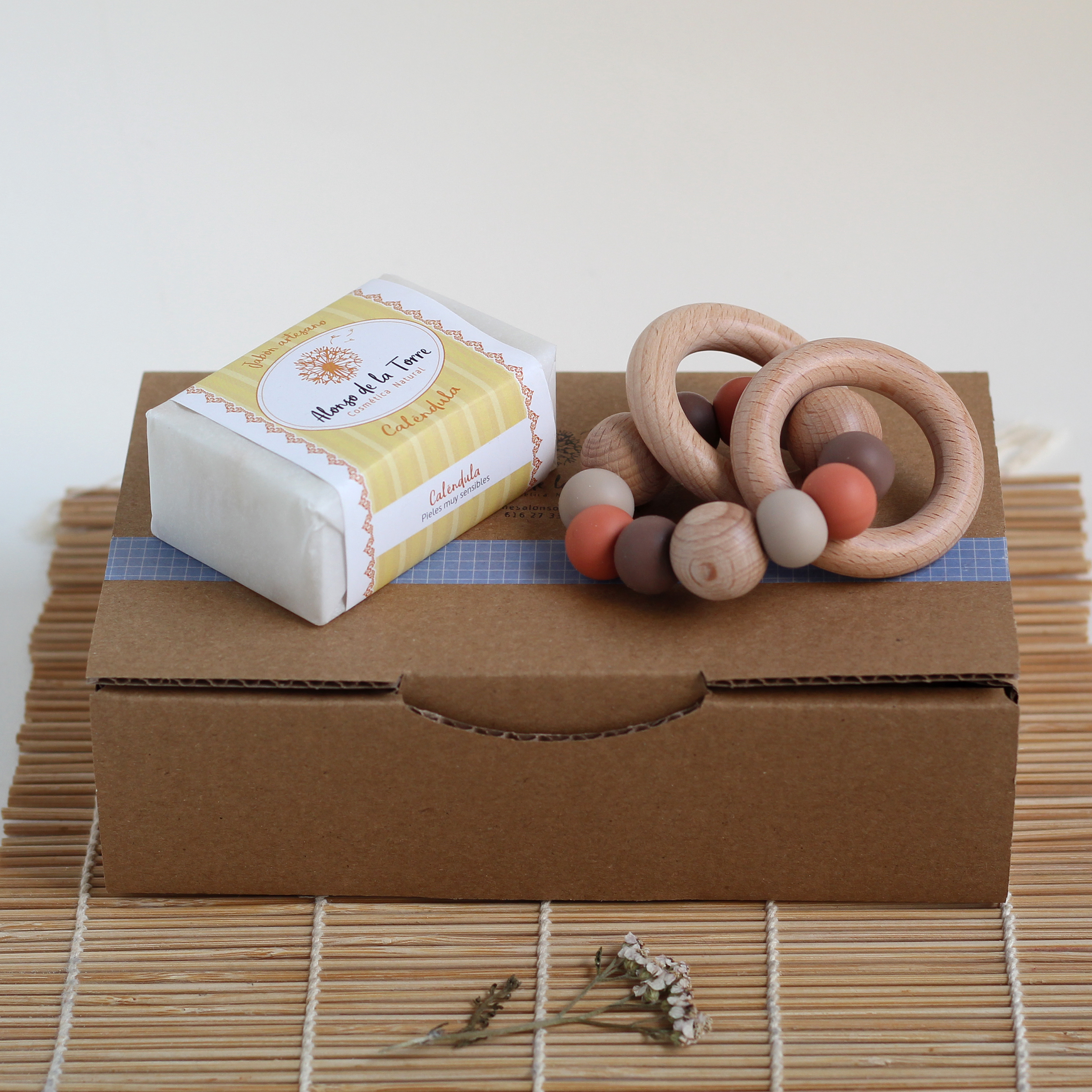 El pack Bebé con mordedor es el regalo perfecto para familias con bebé. Lleva uno de nuestros jabones más suaves para mamá y un mordedor-sonajero para el bebé.
